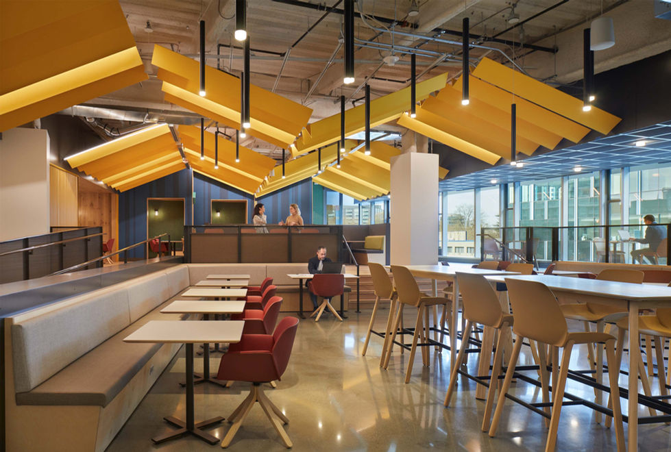 Designed by Graphite Design Group and installed by Treble Interiors, this ceiling baffle installation at Amazon Block 18 features Arktura’s Vapor® Graphic Perf® system. The perforated metal panels incorporate a custom tree-pattern graphic, introducing a subtle visual identity while providing effective acoustic control. The system maintains a light, open ceiling plane and adds rhythm and texture to the space, supporting both sound absorption and a refined workplace environment.
