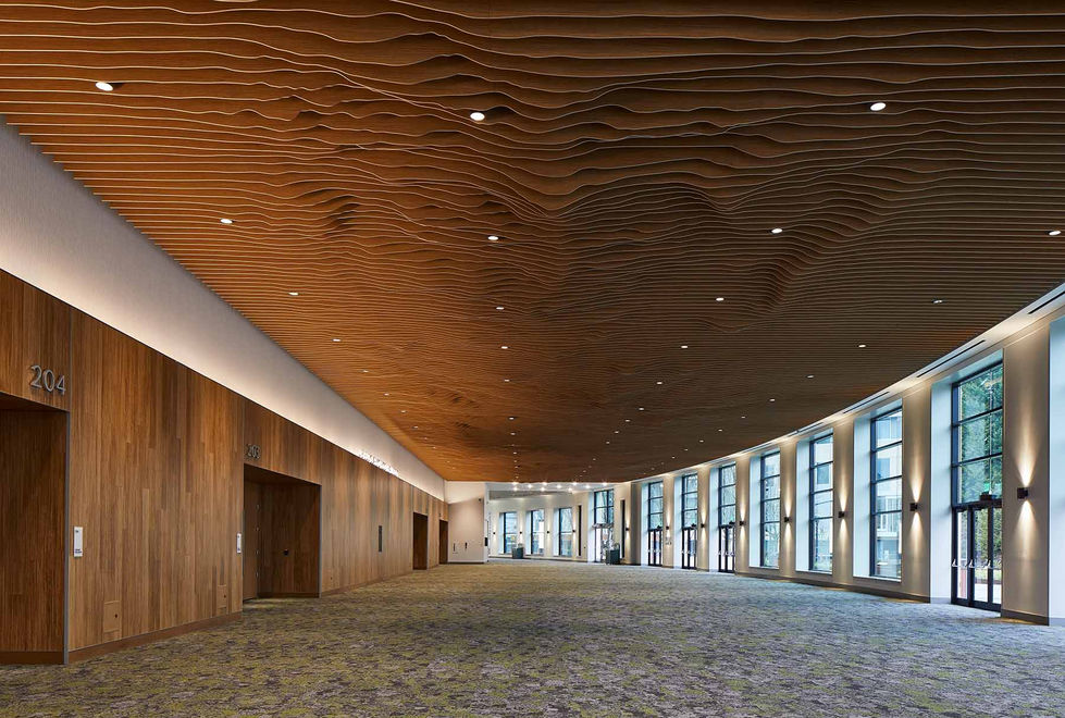 Designed by LMN Architects and installed by Western Partitions, Inc., this custom ceiling baffle installation at the Oregon Convention Center features Arktura’s SoftGrid® system. The modular grid configuration creates a sculptural ceiling plane that enhances acoustic performance while reinforcing the scale and openness of the public space. The custom design integrates seamlessly with the surrounding architecture, providing visual depth and acoustic control across high-traffic areas.